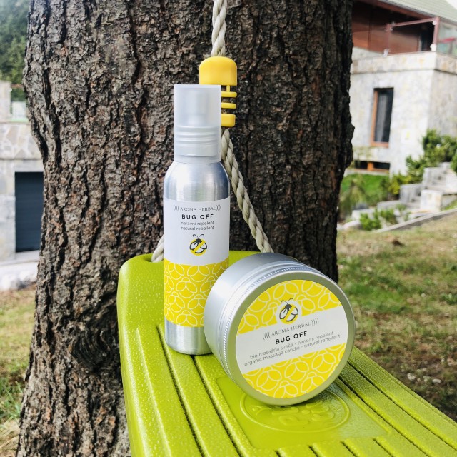 Letos sem na morje odnesla le sprej proti mrčesu Bug off in svečko Bug off (vi ju lahko danes dobite 15% ceneje TUKAJ). Sprej je narejen organski osnovi in vsebuje eterična olja belega čajevca, pelargonije, limone in brina. Je izjemno učinkovit in zelo prijazen za okolje in celo družino. Ne vsebuje niti potisnega plina! Uporabljamo ga lahko na celi družini, vključno z ljubljenčki. Sama vsak dan z njim poškopim psa, pred sprehodom v gozd. Tudi on letos ni imel niti enega klopa ali pika mrčesa.
